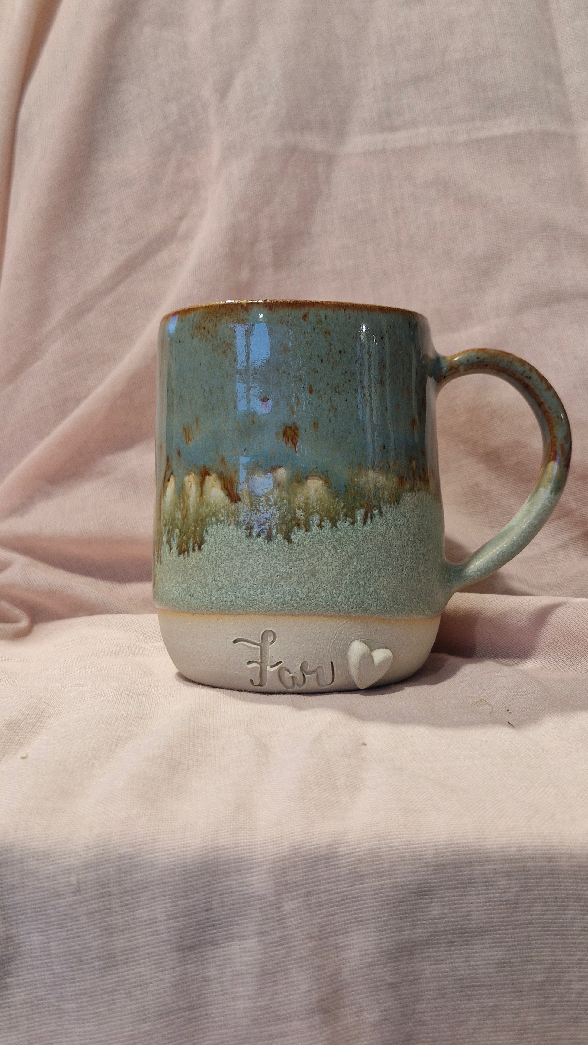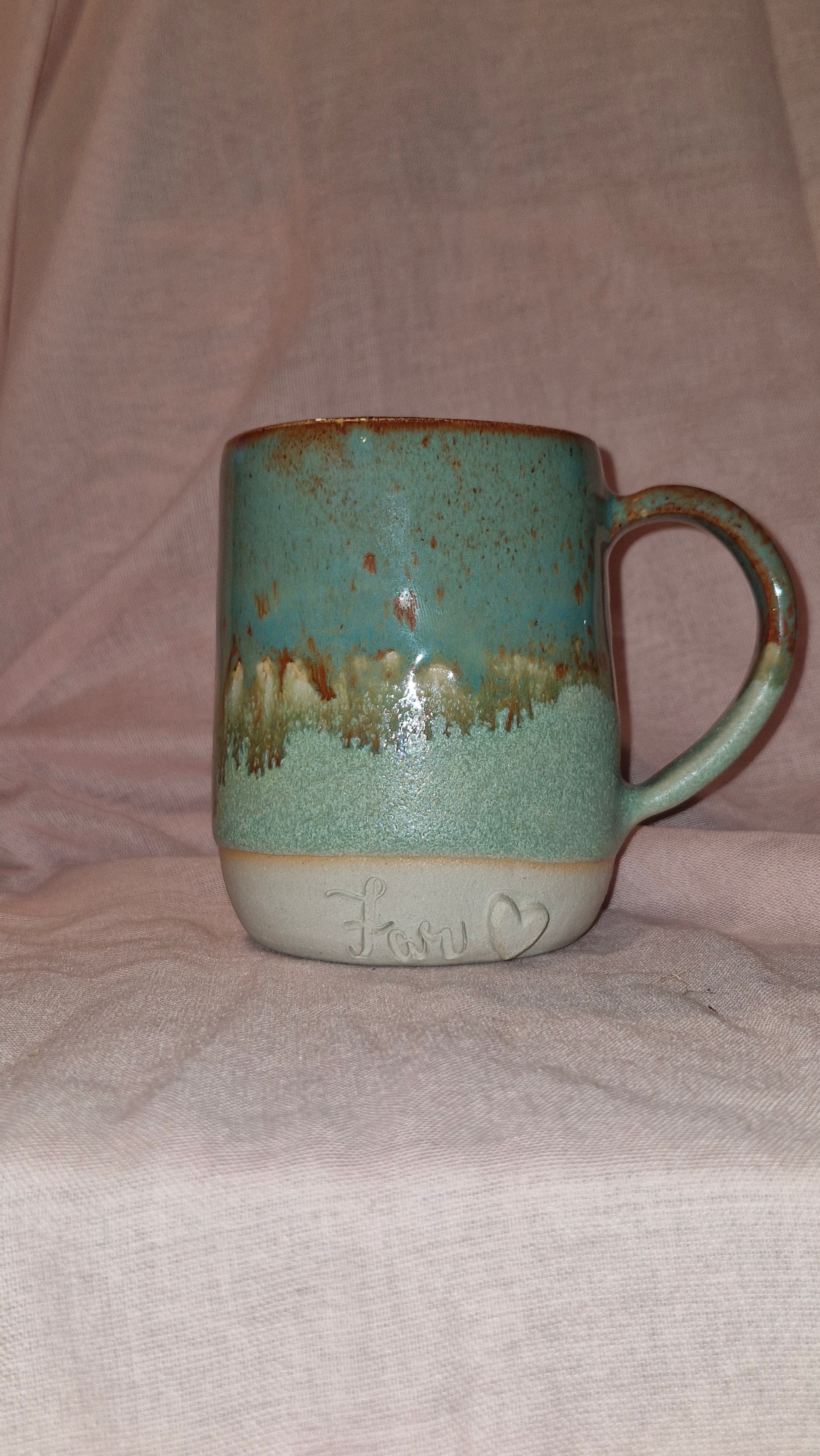 Håndlavet kop i stentøjsler med teksten "Far" – drejet, fin pudset og glaseret af mig i mit lille værksted i Kalundborg.