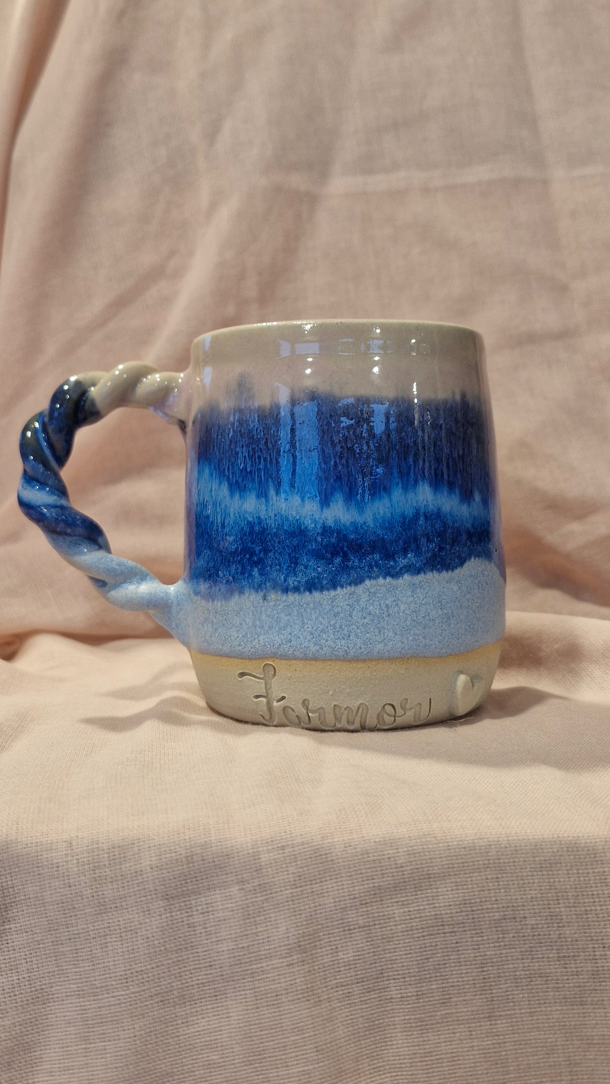 Håndlavet kop i stentøjsler med teksten "Farmor" – drejet, fin pudset og glaseret af mig i mit lille værksted i Kalundborg.