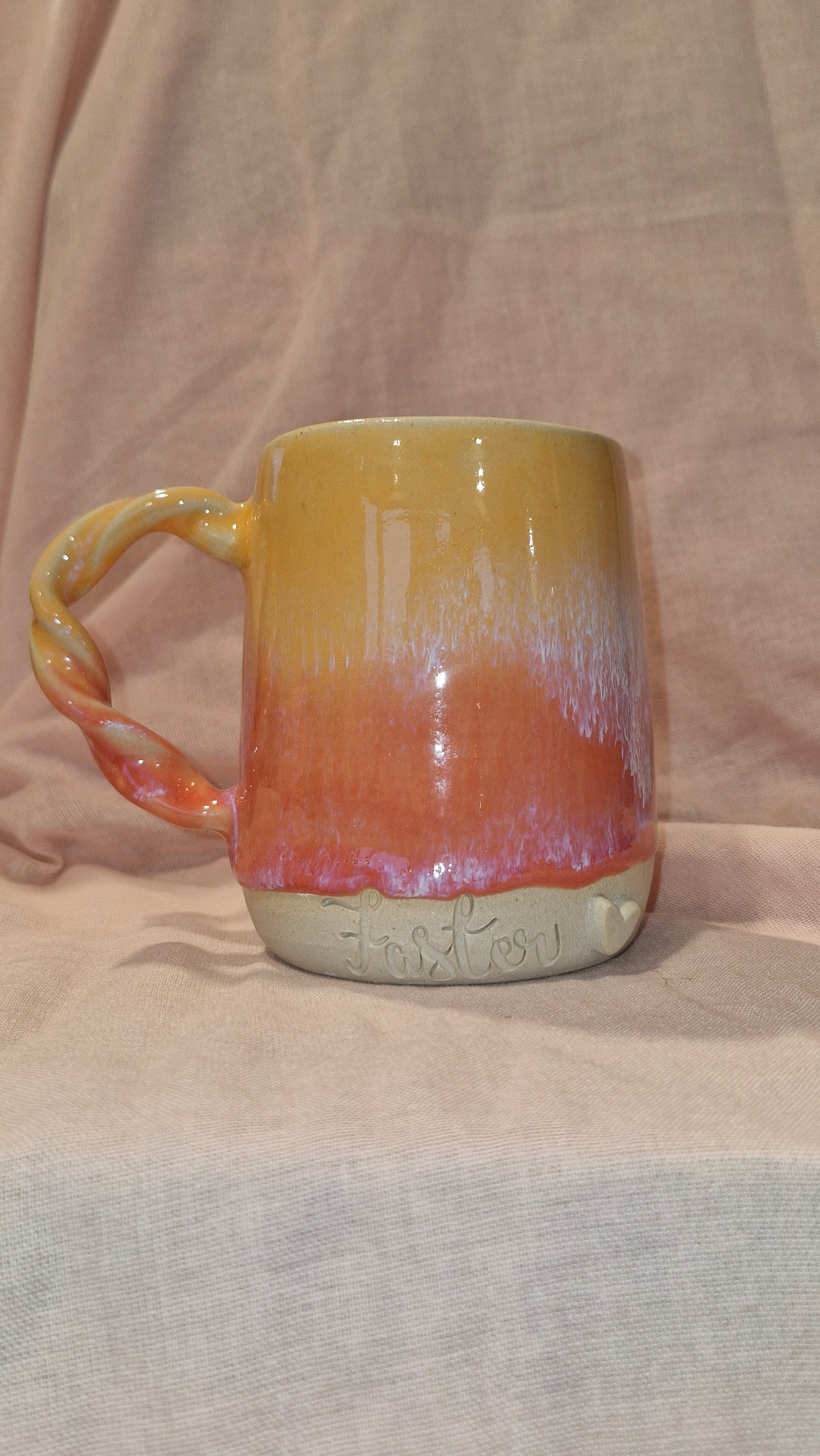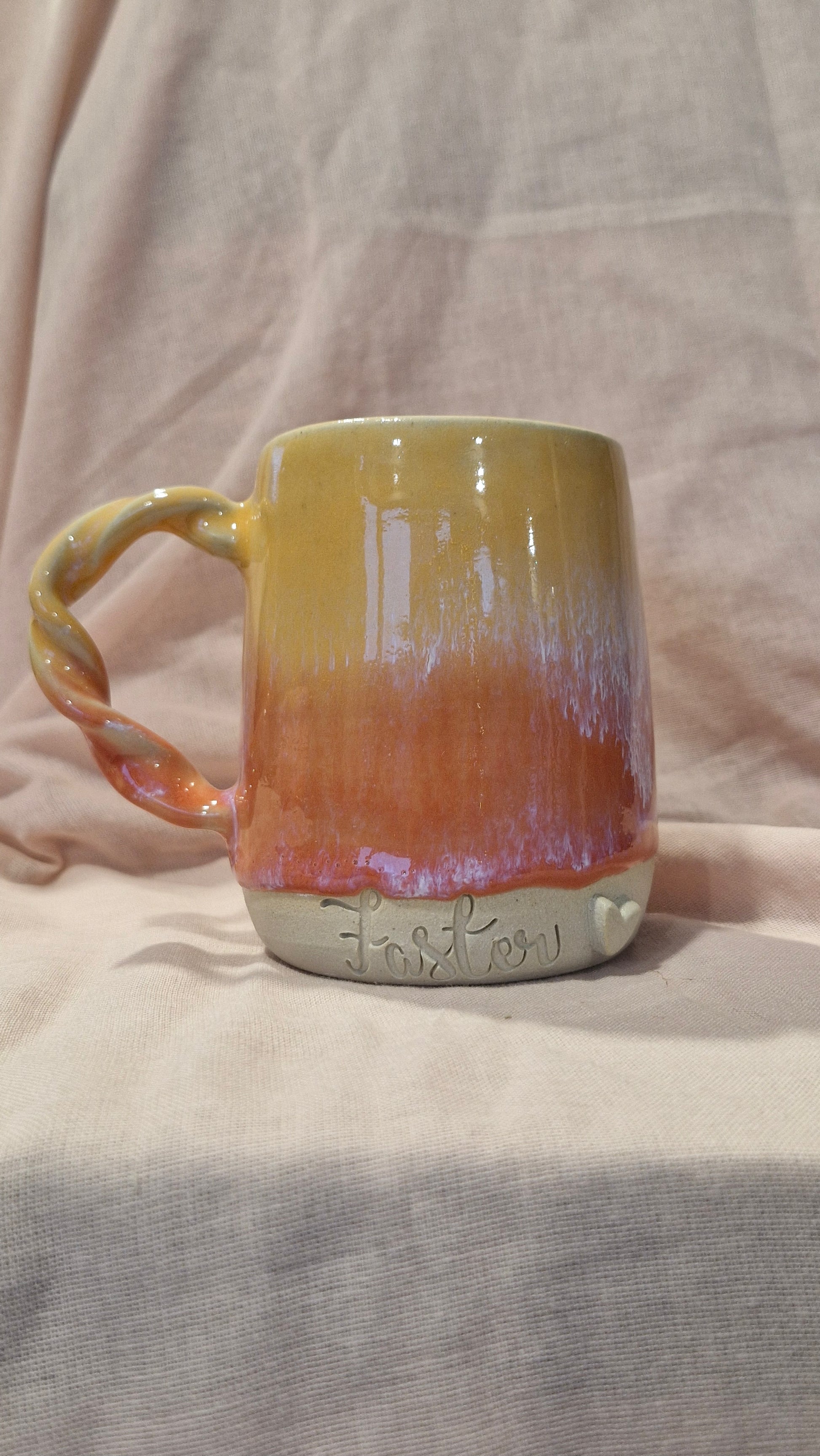 Håndlavet kop i stentøjsler med teksten "Faster" – drejet, fin pudset og glaseret af mig i mit lille værksted i Kalundborg.